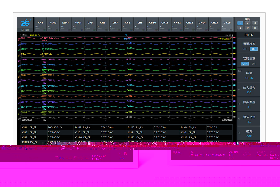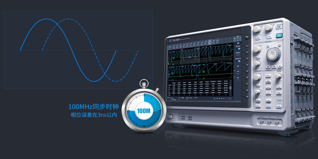示波記錄儀內部設有高穩定性溫度補償的100MHz同步時鐘,避免了溫度帶來時鐘漂移所引入的測量誤差。同時也保證了每一個通道ADC的采樣相位同步,減少了測量時通道間相位角所引入的誤差,誤差在3ns以內,保證所有通道信號同步測試。